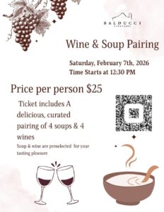 Come join us for our first Soup & Wine Pairing at Balducci Vineyards! February 7th, 2026 12:30 PM Your ticket includes a delicious, curated pairing of four soups and four wines, thoughtfully selected to complement one another. Please note that all soup and wine selections are preselected for this tasting experience. We can’t wait to welcome […]